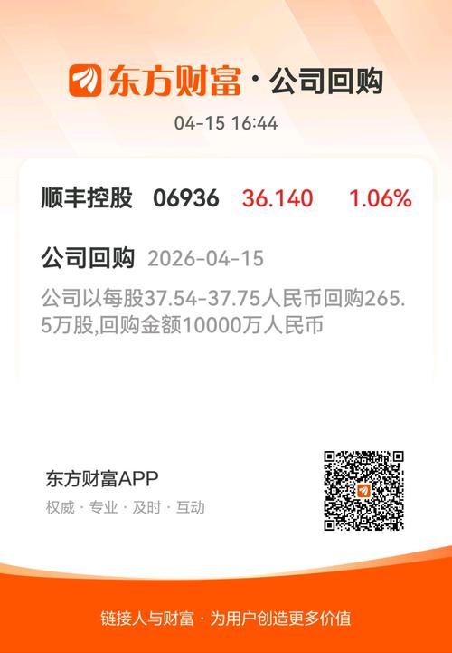 $顺丰控股(SZ002352)$4月15日,公司斥资1亿元,回购266万股,回购价37.54-37.75元。