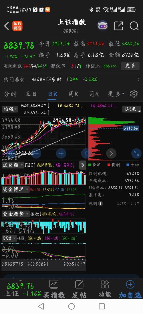 10月17日A股行情,指数全线承压,普跌格局显现,A50今日开盘后也是单边跳水未见止跌! 今日A股市场尽显疲态,主要指数同步开启单边下跌模式,市场情绪承压明显。截至收盘,上证指数报3839.76点,大跌1.95%,盘中未现有效反弹,做空压力集中释放;深证成指、创业板指跌幅进一步扩大,分别下跌3.04%、3.36%,科创50指数更是重挫3.77%,成长板块抛压尤为显著。北证50、沪深300等宽基指数...