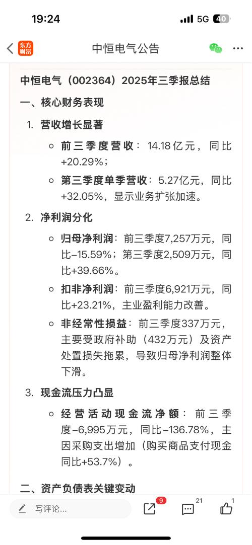 $中恒电气(SZ002364)$总体来说很好,小超预期,判断一个公司发展怎么样,最直观大家肯定看营收,但是我们还必须着重关注扣非,中恒营收和扣非都是两位数增长,并且第三季度扣非同比增长40%,这是一个很好的信号,还值得一提的是目前还没有到爆发期,第四季度甚至明年,会更加亮眼。