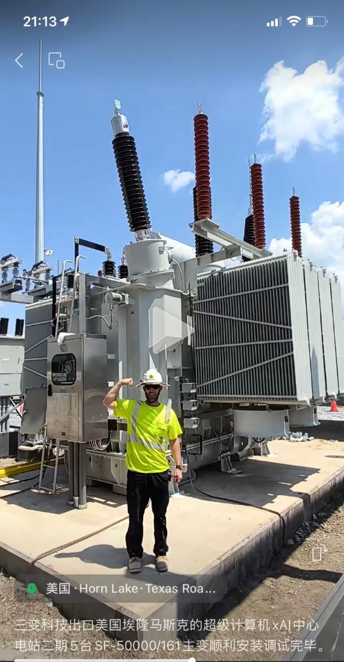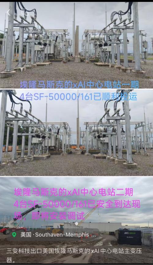 $三变科技(SZ002112)$ 三变科技出口美国埃隆马斯克的超级计算机xAI中心电站二期5台SF-50000/161主变顺利安装调试完毕。$金盘科技(SH688676)$$中恒电气(SZ002364)$