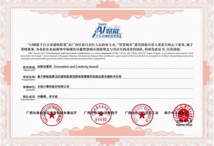 近日,太极股份凭借“基于群智能算法的建筑能源流群体智慧管控低碳运营关键技术应用”项目,在广西壮族自治区人民政府主办的“AI赋能千行百业超级联赛”——“智慧城市”建设创新应用大赛中,成功斩获创新创意奖,彰显了公司在智慧城市与绿色低碳领域的技术创新实力与实践成果。 该赛事以“好房子、好小区、好社区、好城区”建设为核心导向,聚焦人工智能技术在智慧城市领域的落地应用。 此次获奖项目以雄安商务服务中心园区为...