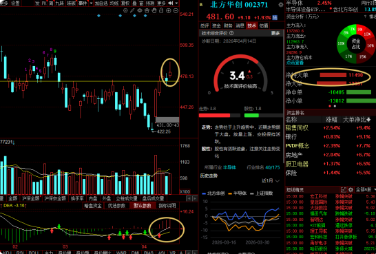 前面几天我们一直跟踪这三只票,上周五还在聊"三只票开始各走各路、节奏分化",今天盘面就给了一个漂亮的回答——沪电股份10CM涨停、北方华创涨1.93%、立讯精密涨0.92%,三只齐涨共振。分化只是暂时的,主线从来没有走。 1、北方华创(002371)——稳步回升482元 北方华创今天涨1.93%收481.60元,把昨天0.92%的回调完全吃回来了。从4月8日单日大涨9.41%以来,北方华创的节奏就...