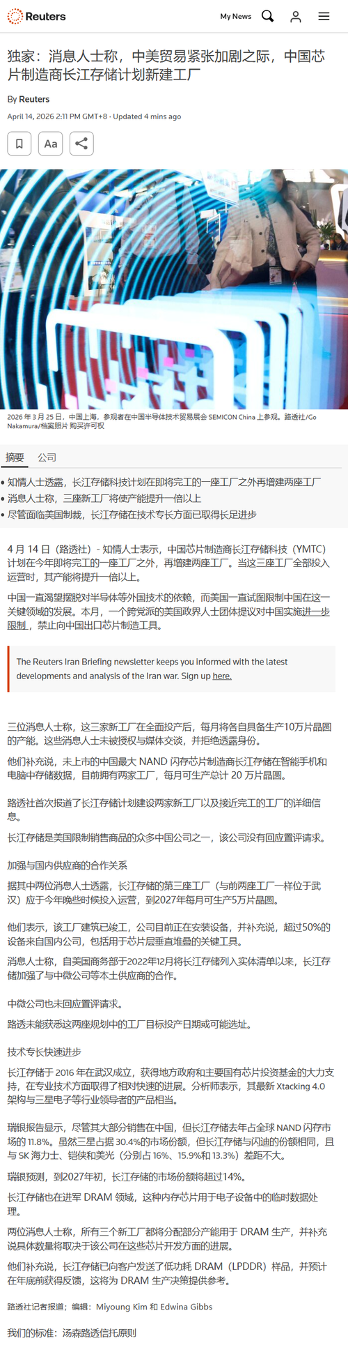 $京仪装备(SH688652)$$北方华创(SZ002371)$$中微公司(SH688012)$ 4月14日(路透社)-知情人士表示,中国芯片制造商长江存储科技(YMTC)计划在今年即将完工的一座工厂之外,再增建两座工厂。当这三座工厂全部投入运营时,其产能将提升一倍以上。
