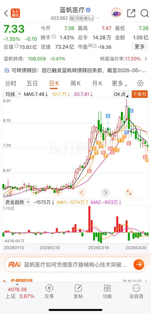 $蓝帆医疗(SZ002382)$ 蓝帆医疗持股第38天,早盘7.44元减仓,新进华兰股份。