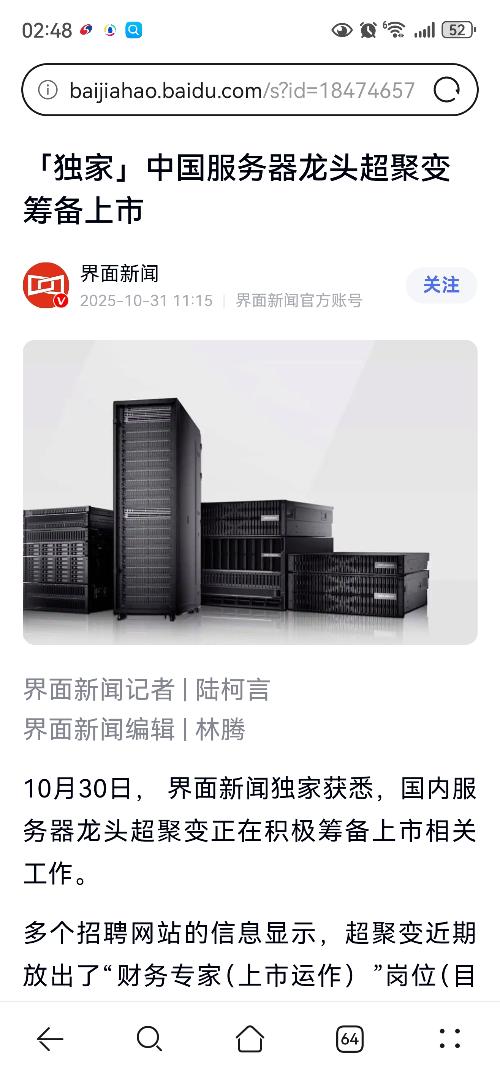《科创板日报》记者从知情人士处确认,超聚变确实正在筹谋上市。 近日,多个招聘网站的信息显示,超聚变近期放出了“财务专家(上市运作)”岗位(目前该岗位已更名)。该岗位信息显示,候选人须具备上市企业财务管理经验,曾直接参与上市公司年报、季报发布及合并财务报表等工作,并熟悉上市公司体系建立及财务系统管理。 超聚变的前身是华为的X86服务器业务。2021年,在海外因素的推动下,华为作出了重大战略调整,将旗...