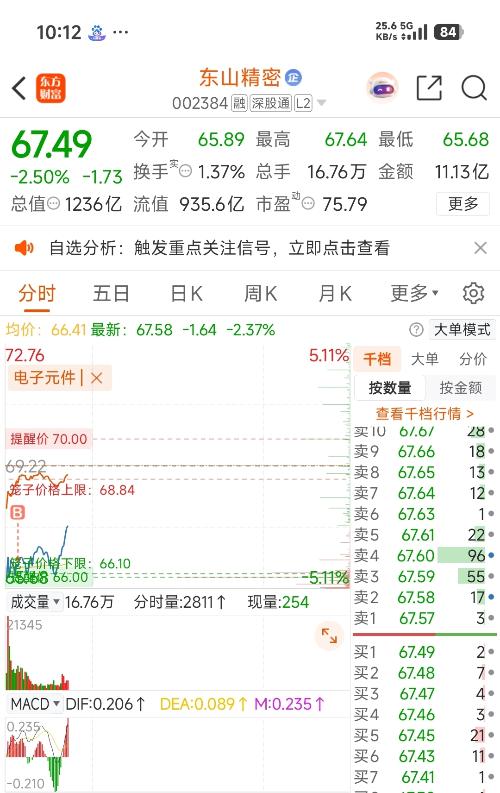 $东山精密(SZ002384)$66.74元,就一个字,加仓买进2000股,另外挂的一个65.85元的买单!#周度策略# 很快就会反转向上