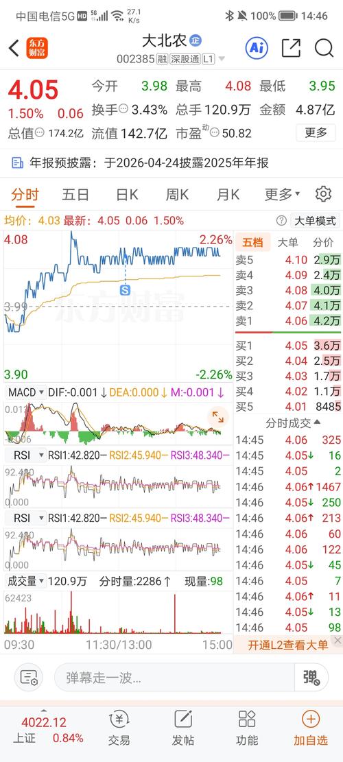 量能回暖、低位企稳——大北农4月14日复盘(私仓随笔) 低吸吃肉,高抛落袋,牛运满堂,账户长虹 (4月14日收盘复盘) 一、今日行情回顾:温和放量收阳,底部韧性显现 今日(4月14日)大北农(002385)小幅高开,全天震荡上行,收盘报4.06元,上涨+0.07元(+1.75%)。 -开盘:3.98元;最高:4.08元;最低:3.95元 -成交量:130.46万手;成交额:5.26亿元;换手率:3...
