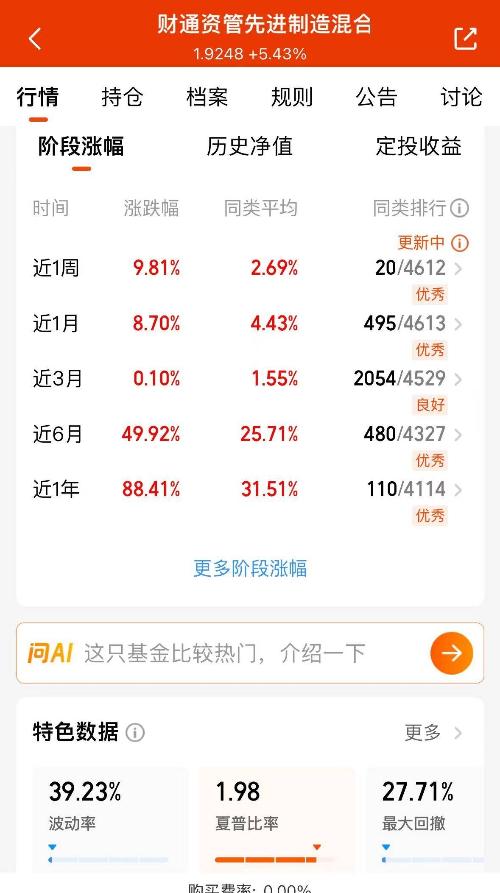 本来还在犹豫要不要加仓,看到财通资管先进制造今天大涨5.43%,前面四连涨后仅微跌0.51%,果断决定借行情继续加点,跟着优质基金走没错。$宏利新兴景气龙头混合A$$南方优势产业(LOF)$$工银医药健康股票A$