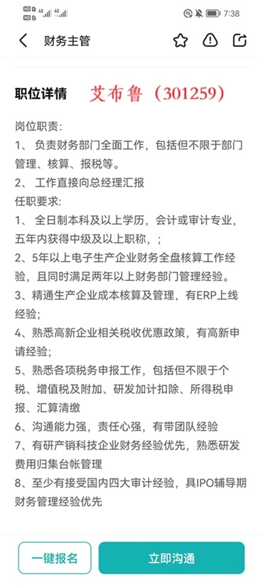 #英伟达遭反垄断调查!产业影响几何?##新型储能新政落地,引爆2500亿投资##商务部对美模拟芯片发起双反调查##存储芯片掀涨价潮!投资机会几何?##华为十大预测:算力将暴增10万倍#$和而泰(SZ002402)$$天普股份(SH605255)$$东芯股份(SH688110)$ 近日艾布鲁紧急招聘有IPO经验的财务主管