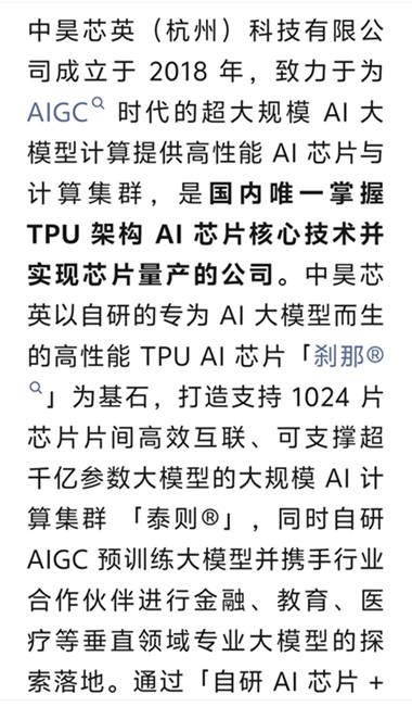 中昊芯英收购天普股份(605255),只是将天普作为N个子公司之一,为独立IPO估值增加筹码。中昊之前就有很多个子公司,前段时间又在上海注册了2家子公司。天普只是一家燃油车零部件夕阳行业小微公司,如果改造升级成为电动车零部件公司,可为中昊进军电动车芯片竞争出一点力,另外,中昊旗下如果有一家控股上市公司,独立IPO估值也会更高,IPO审核也更容易过关。对参股公司艾布鲁和科德来讲,中昊估值越高,对艾布鲁和科德越有利。艾布鲁(301259):公司控股60%的子公司星罗中昊持股中昊芯英9.73%,整合AI芯片技术,形成“算力+芯片”的产业链布局。艾布鲁2025半年报数据中心租赁收入超去年全年,成为tpu服务器和算力公司。中昊芯英泰则服务器自研TPU芯片,具备良好异构扩展能力。艾布鲁与中昊芯英高层交叉任职。星罗智算与中昊芯英合作背景与战略定位星罗智算(艾布鲁控股子公司)与中昊芯英自2024年7月达成战略合作,共同推动国产自主可控AI算力发展。星罗智算定位为国产AI算力中心建设商,中昊芯英则提供其自研TPU芯片及算力硬件支持,目标构建大规模国产算力集群。双方合作被类比为“CoreWeave与英伟达”的共生关系,强调技术+资本的双轮驱动。中国电子报第一次公开报道:中昊芯英两年半前的第一代TPU可支撑AlphaZero、AlphaGo、GPT、Qwen、DeepSeek等模型,服务于无人驾驶模型训练、蛋白质结构计算检索、生产质量管控、文档智能助手、政务法律援助等行业场景。这是官方通讯稿报道中昊TPU,给予广泛支持,用于超多垂直行业,且直接大量举出不同类型例子。国内目前只有昇腾和中昊能集群训练超大模型,其它各种基本只能推理。上面文字之前只有Deepseek、无人驾驶训练、蛋白质结构计算、政务法律援助等措辞出现过,其它均为第一次公开报道。完全可信可引用。中昊芯英获得2025全球数字贸易创新大赛人工智能赛道-金奖!