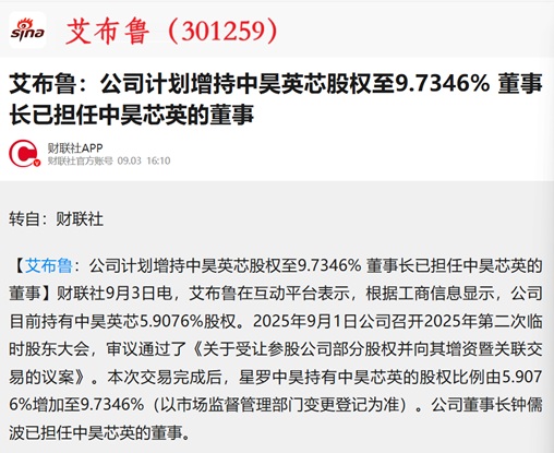 - 艾布鲁2024年一口气在杭州注册3家新子公司,其中一家子公司还持有中昊芯英9.7346%的股权,两家高管还交叉任职!近日,艾布鲁急招有IPO经验财务人员,这是提示最明显不过了!昨天湖南省上市企业在全景网直播与媒体和投资人互动,艾布鲁居然不在名单上!看来很快将是浙江杭州上市公司了!