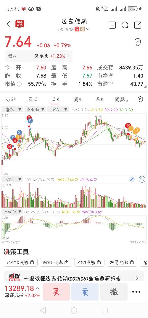 $远东传动(SZ002406)$看好就买,不看好就卖,没必要骂股票,这个股票我7.76的本,一开始补仓补的多了,仓位到了20%,后面摆烂了,一直拿,跌到7.28照样看好。不动就是最好的办法,没耐心追涨杀跌到头来只会两边都买不到#炒股日记#