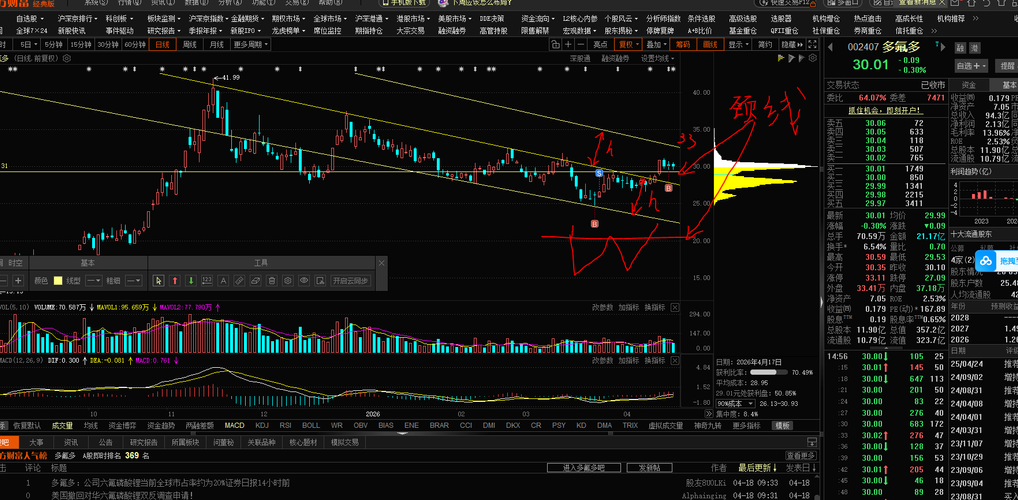 有人问如果要上涨,应该可以涨多少?按照理论上涨幅不会高,但如果有特别利好,这个高度就不准确了,只是给大家介绍一个方法,就是你跌的有多深,你涨的就有多高。这个只是短期的波段,实际上它整体跌幅并不够,从15涨到41,然后从41跌到30,才跌了25%,调整时间很短也就是5个月。 总体说来,它还是相当的抗跌;理论总是和实际有出入,并不能代表它一定发生,只是代表了发生的概率比较大