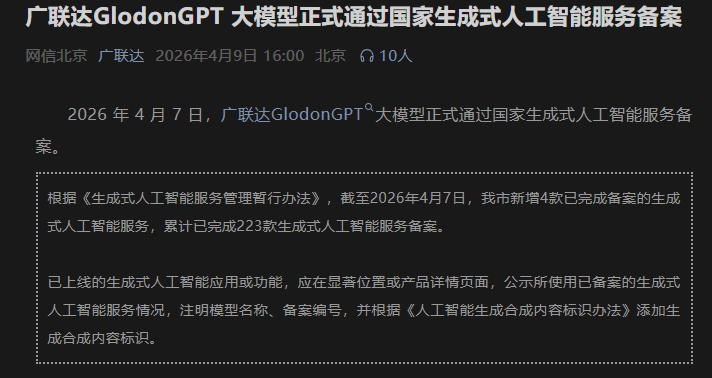 2026年4月7日,广联达GlodonGPT大模型正式通过国家生成式人工智能服务备案,成为国内率先完成国家级合规备案的产业级大模型产品。这一纸权威认证,绝非单一行业软件的功能升级,而是彻底击碎A股市场长期以来对广联达“地产链、建筑服务商”的致命误判,宣告这家企业正式跻身国内合规大模型厂商第一梯队,其早已完成全基建赛道覆盖的技术能力与AI龙头定位,将迎来彻底的估值体系重构,股价趋势反转的最强催化剂已...