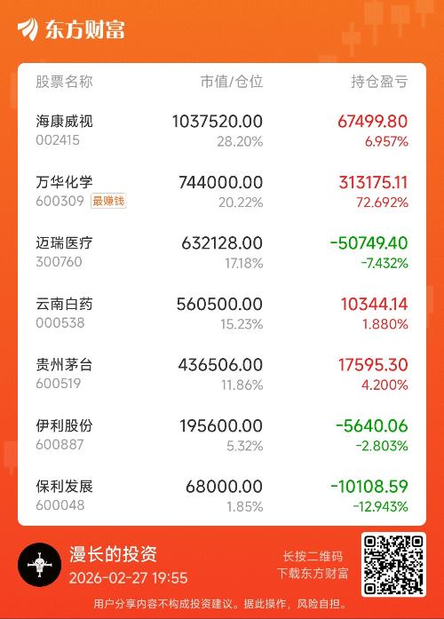 资产变动-6.82(-1.89%)余额354.98 年内实盘+6.71(+1.97%) 持仓盈亏+20.37 年内沪深300(+2.13%) 年内股息0(按收付实现制记录) 持有股票天数: 海康威视281天 迈瑞医疗532天年内股息+1457 万华化学275天 贵州茅台242天年内股息+8397.9 云南白药263天年内股息+9498 伊利股份266天 保利发展240天 风险提示:本文/以上观点不...
