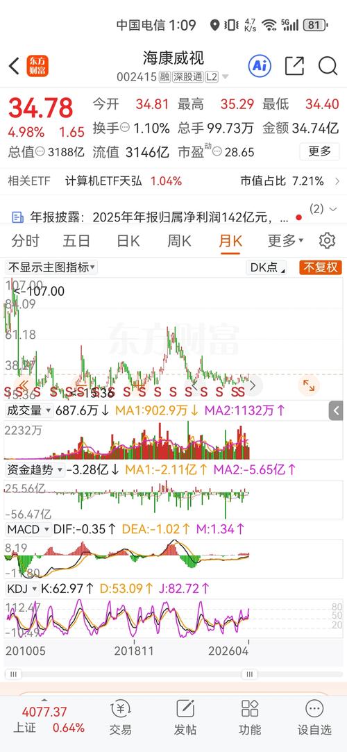 $海康威视(SZ002415)$ 今天收盘,海康威视站上34.77元,大涨近5%,盘中触及35.29元的阶段新高,伴随96.76万手的放量成交,这不是一次普通的反弹,而是市场对其戴维斯双击逻辑的集中确认。从2025年四季度的业绩拐点,到2026年一季度的全面爆发,这家被低估了三年的安防龙头,终于迎来了业绩与估值同步抬升的双击时刻,35元,更像是新一轮行情的起点,而非终点。 很多人说,海康的春天,是...