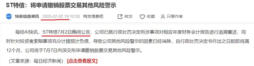 ST特信7月7日公告,公司股票交易将于7月9日起撤销其他风险警示,证券简称由“ST特信”变更为“特发信息”,日涨跌幅限制由5%变为10%。 ST特信7月2日申请摘帽到7月9日正式摘帽,只用了7天时间。