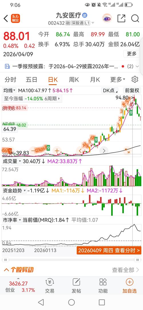 个股记录:(仅为个人看法,不构成任何投资建议) 九安医疗 $九安医疗(SZ002432)$今日盘中探底回升,整体呈弱势整理态势,分歧依旧明显。 公司为家用医疗设备龙头,疫情后转型慢病管理与CGM赛道,现金储备超千亿,财务安全边际极高。2025年业绩预增超21%,但利润依赖投资收益,主业仍处修复期。 板块方面,家用医疗、医疗器械板块小幅分化,行业景气度仍在。短期处于震荡消化阶段,后续可观察CGM产品...
