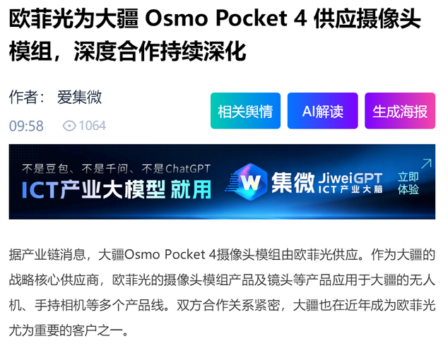 传大疆 Osmo Pocket 4 摄像头模组由欧菲光供应,双方深度合作持续深化