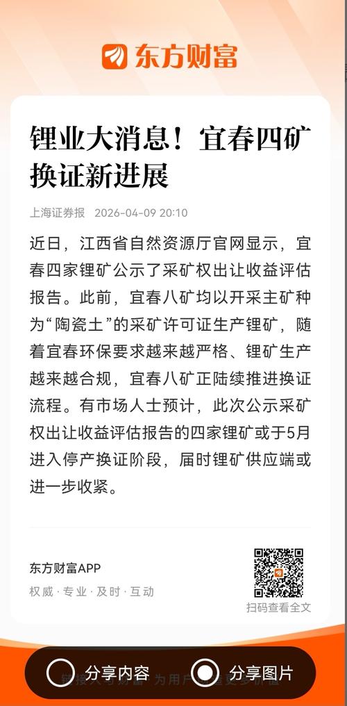 $赣锋锂业(SZ002460)$$赣锋锂业(HK|01772)$$天齐锂业(SZ002466)$【宜春四矿换证新进展或于5月进入停产换证阶段】财联社4月9日电,江西省自然资源厅官网显示,宜春四家锂矿公示了采矿权出让收益评估报告。此前,宜春八矿均以开采主矿种为“陶瓷土”的采矿许可证生产锂矿,随着宜春环保要求越来越严格、锂矿生产越来越合规,宜春八矿正陆续推进换证流程。有市场人士预计,此次公示采矿权出让...