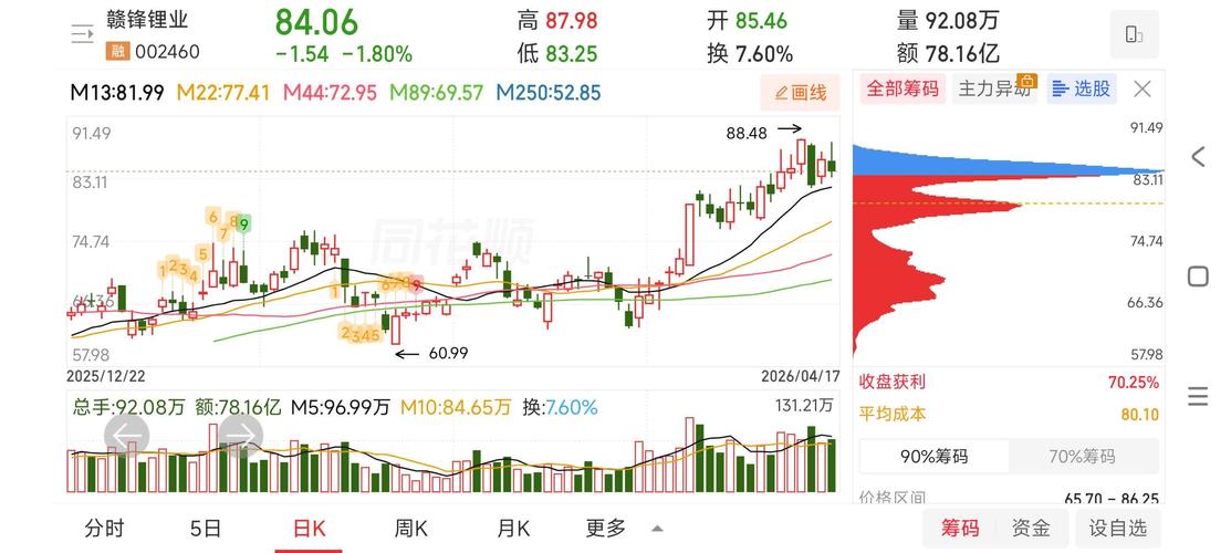 赣锋锂业:赣锋短期的盘面充满了分歧。周四的巨量上涨和周五的活力回吐,显示多空双方在“业绩底”确认后的博弈异常激烈。技术面上,股价在88元附近遭遇强大阻力,而下方82元则是关键支撑。一季度业绩的逆转,得益于碳酸锂价格回升至15万元/吨以上,以及阿根廷盐湖、马里锂矿等项目产能释放带来的成本优化。但周五碳酸锂价格继续上张,锂矿标的却没有跟张,说明市场已经开始出现分化,接下来很有可能会跟sui其他科技板块...