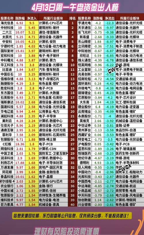 4月13日周一主力资金净流入和净流出前40名个股揭晓,这可是赚钱的重要线索!就拿之前4月3日非货币ETF市场来说,海富通中证短融ETF净流入额达16.99亿元,而华泰柏瑞中证A500ETF则净流出9.33亿元。4月7日,主力资金抢筹热门板块有基础化工、电子和煤炭。基础化工板块净流入44.66亿元居首,涨幅3.66%,像有机硅概念的东岳硅材单日获主力资金净流入3.31亿元。电子板块因AI算力驱动,净...