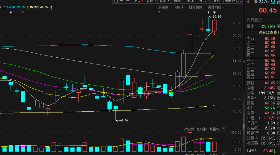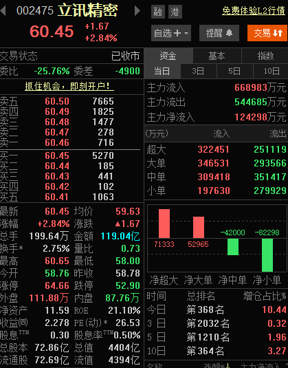 盘面观察与个股记录 $立讯精密(SZ002475)$ 从盘面上看:上涨2.84%,成交额119.04亿,换手2.75%。股价成功站上60附近,这是突破的第一步,均线多头排列,MACD红柱持续扩大,资金流入远高于行业平均水平,做多意愿较强 基本面与消息面:消费电子+汽车电子+数据中心三大业务协同,受益AIPC、新能源汽车渗透率提升,存储涨价带动业绩增长。此前披露“质量回报双提升”行动方案进展,生产效...