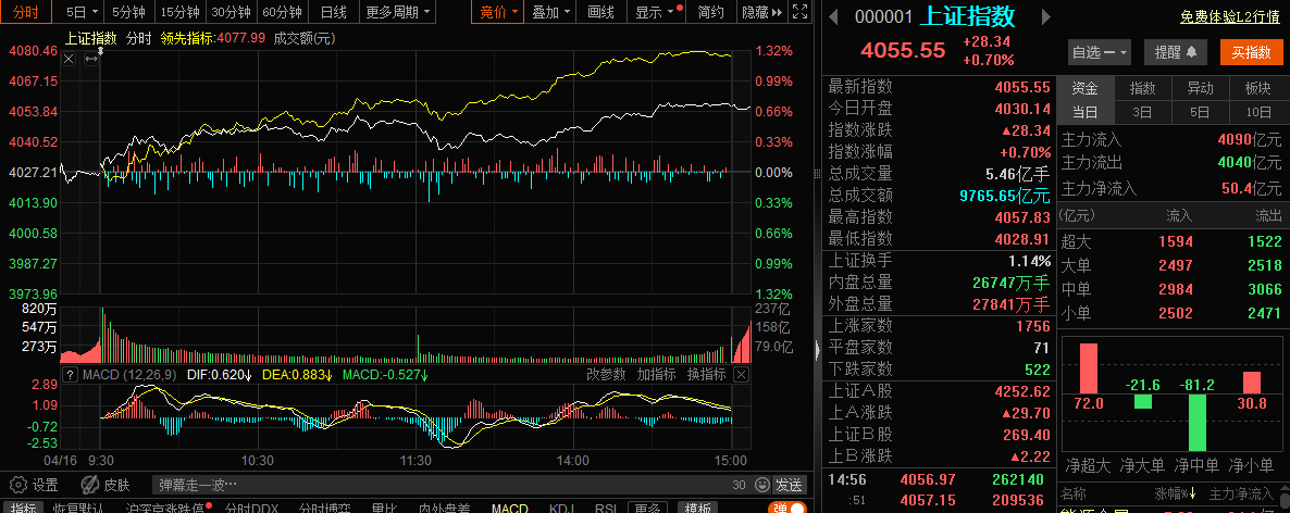 大盘三大指数全线大涨,这困扰股民很久的黑周四魔咒今天是打破了,就因为今天是黑周四大家对今天本来都没那么高期望的,这市场就是这么意外惊喜,另外市场很多人将4050作为这沪指的反弹高点今天是也是成功涨破的了哦,这下对于大盘指数的持续震荡上攻步伐不能再有什么质疑和担忧了吧,这市场信心就是涨出来的。整体市场今天是有近四千三百家数上涨的,股民也是开心回血的一天,但近期市场有个规律是普涨普跌每天在轮换,明天还...