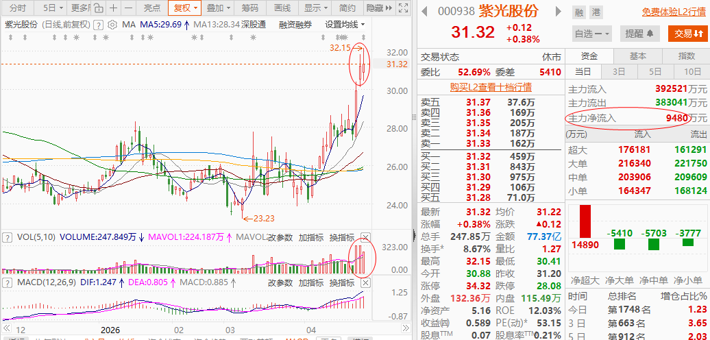 亨通光电600487:周五全天反复震荡,冲高回落之后再度收回,收出震荡十字K,多空博弈充分。股价稳定运行在周期均线上方,中期趋势保持健康。短期波动属于上行过程中的正常换手消化,整体量能温和,下方承接稳固。今日若顺势回踩均线支撑、情绪企稳,可逢低布局等待修复。核心逻辑:新型光纤商用落地+高速光通信全品类布局+海风赛道核心标的;前沿光纤技术达到行业领先,落地商用合作,新材料产能稳步推进。算力通信硬件产...