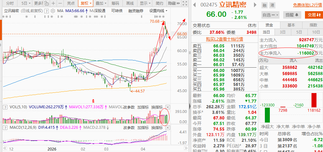立讯精密002475:周五震荡回落,小幅收阴,整体运行在近期箱体区间之内,短期均线未形成压制,只是阶段性节奏休整,并非趋势走弱。成交平稳,无恐慌出逃行为,中长期上行结构完整。 今日以持仓观望为主,早盘弱势但承接平稳就等待修复;回踩企稳之后,再择机做波段差价。 核心逻辑:高速传输线材量产落地+光通信组件客户测试+智能装备代工合作;新一代高速产品持续研发落地,光电硬件同步推进海外客户认证。绑定头部智能...