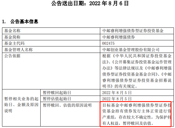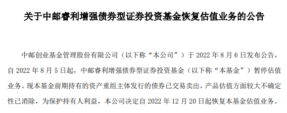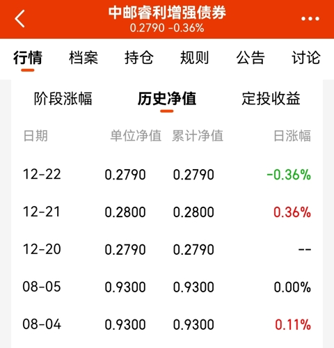 12月20日,$中邮睿利增强债券$(002475)更新基金净值:0.279元,较前一次公布的净值(0.93元)少了70%!缘何停更四个半月-70%这个数字,乍一看很吓人。一个债券基金,基金净值-70%,估计很多人都要吓一跳的。不过还是要知其所以然的。先讲讲为何基金净值停更四个半月之久。2022年8月6日,中邮睿利增强债券(002475)发布了一则公告,内容是暂停赎回且暂停估值,而估值都暂停了,自...