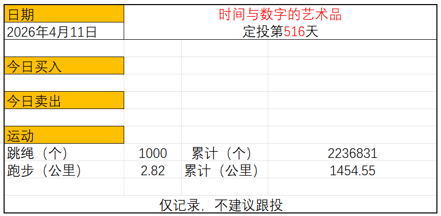 运动与投资第516天 2026年4月11日 今日定投: 周六,没有定投 跳绳:1000个,累计跳绳:2236831个 慢跑:2.82公里,累计慢跑:1454.55公里