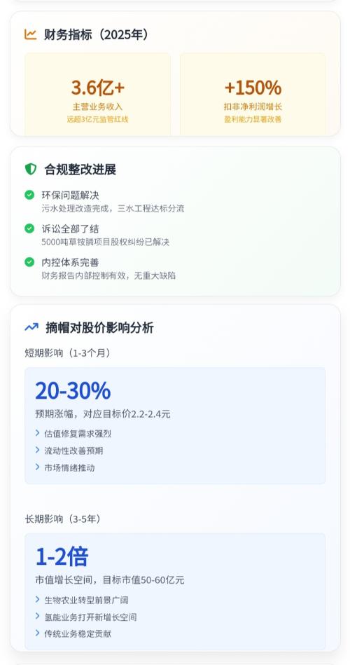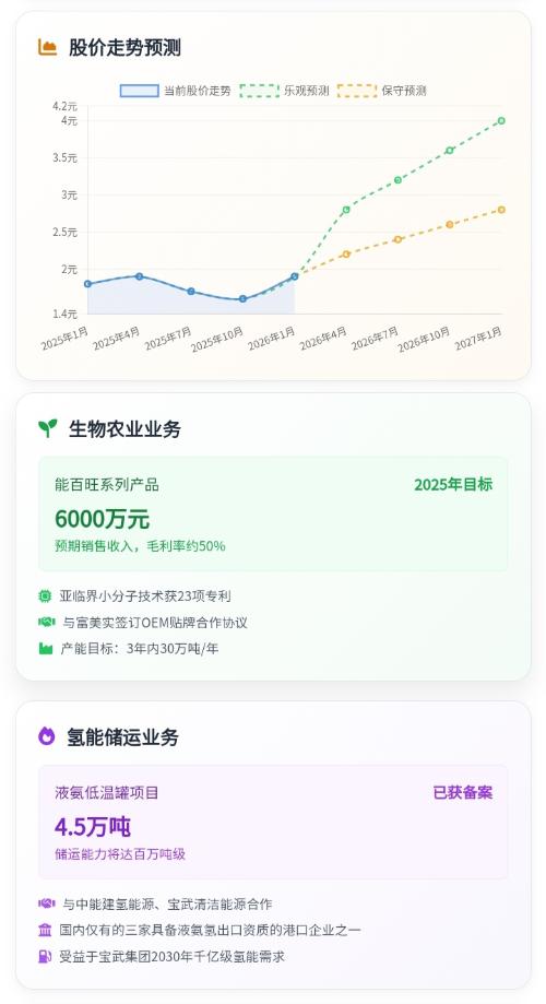 - 2026年公司业绩扭亏为盈(净利润1.2-1.5亿元)的核心驱动,来自三大业务的产能释放+量价齐升+新业务落地,叠加历史包袱出清,形成确定性增长共振。 小分子功能肥(生物农业):最大增量 - 产能爆发:从2万吨扩至10万吨,规模效应显著。 - 营收与毛利:2026年营收有望破亿;毛利率超50%,为核心利润来源。 - 客户与市场:获先正达、富美实等国际巨头OEM订单;国内已覆盖17个省份。 草铵膦(传统农药):量价齐升 - 权益产能提升:自身产能从3000吨恢复至4500吨;叠加收回瑞凯化工5000吨权益,总权益产能增加。 - 行业红利:供给收缩、价格回暖,推动量价齐升。 氨氢能源与石化仓储:新业务放量 - 氨氢储运:2026年二季度投产,预计新增营收2-3亿元;拥有稀缺资质,与宝武清能、中能建等巨头合作。 - 石化仓储:受益油价上行与地缘政治驱动的贸易活跃,业绩同步改善。 额外催化:历史包袱出清 科菲特破产、瑞凯清算、诉讼和解及资产出售等,进一步增厚利润、减轻财务负担。