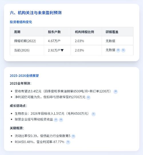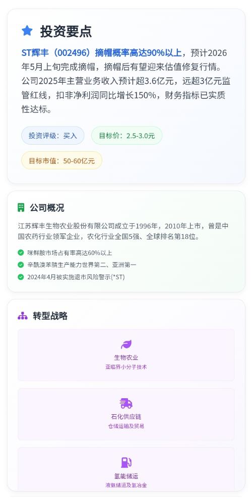 *ST辉丰(002496)的业绩拐点已非常临近,核心逻辑在于历史包袱出清、主业经营改善、新业务放量与摘帽预期的多重共振。 一、财务拐点:亏损收窄,营收达标(保壳成功) 根据2025年度业绩预告: 营收:预计3.6亿~4亿元,远超3亿元摘帽红线。扣非净利润:亏损1.3亿~1.7亿元,同比减亏27%~44%。净资产:三季报为12.8亿元,持续为正。 关键信号: 2025年前三季度营收2.19亿元(+4...