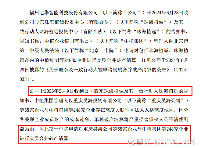 $ST达华(SZ002512)$ ST达华最近有可能出两大核心利好 2026年4月10日,北京一中院裁定中植系316家企业实质合并破产,珠海植城、珠海植远(合计持股16.22%)纳入清算,ST达华核心股权处置进入实质阶段,叠加处罚结案落地,两大明确利好驱动价值重估。 一、处罚结案利好(2026年4月中下旬至5月上旬) 公司2026年2月27日收到福建证监局《行政处罚事先告知书》,因2021-202...