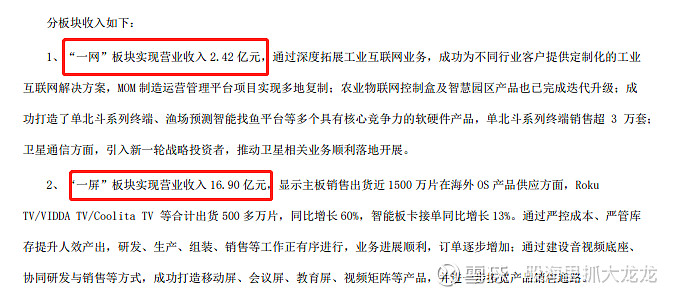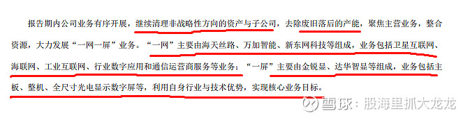 我们接着上一篇帖子继续看: 三、公司战略转型转向何方,实际行动有哪些? 公司的主要业务是一网一屏,根据公司披露:公司持续聚焦“一网一屏”产业,以信息服务、卫星通信、新型显示制造为核心业务,打造人工智能能力,通过产业与业务的协同发展,致力于成为全球领先的综合信息服务提供商。“一网”主要由海天丝路、万加智能、新东网科技等组成,业务包括卫星互联网、海联网、工业互联网、行业数字应用和通信运营商服务等业务;...