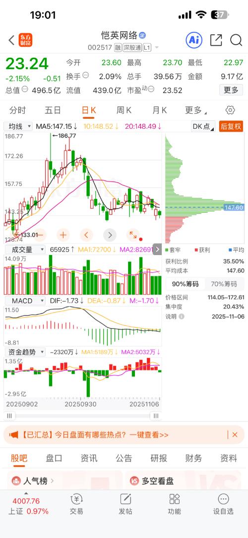 $恺英网络(SZ002517)$典型的下跌趋势了