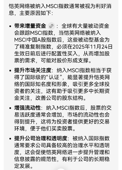 凯英网络重大利好,MSCI中国A股指数新纳入标的 带来增量资金:全球有大量被动资金(如ETF)会跟踪MSCI指数。当恺英网络被纳入后,这些基金为了精准复制指数,必须在生效日(2025年11月24日)前后进行配置性买入。这种确定的买盘会直接增加股票的需求,可能对股价形成支撑。历史经验表明,新纳入的股票在生效日附近常有超额收益。 提升市场关注度:纳入MSCI指数相当于获得了一个国际级的“认证”,能显著...