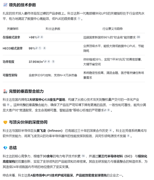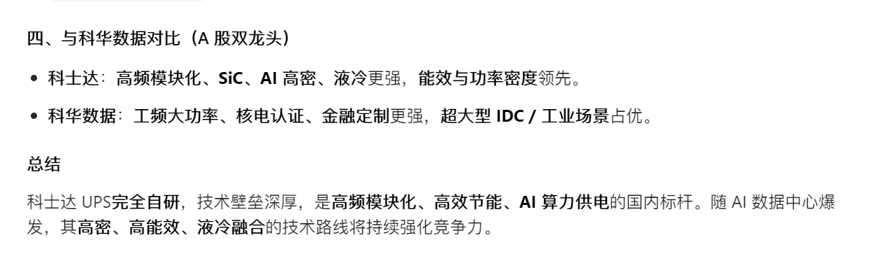 科士达与科华数据的技术对比: 科士达UPS完全自研,技术壁垒深厚,是高频模块化、高效节能、AI算力供电的国内标杆。随AI数据中心爆发,其高密、高能效、液冷融合的技术路线将持续强化竞争力。