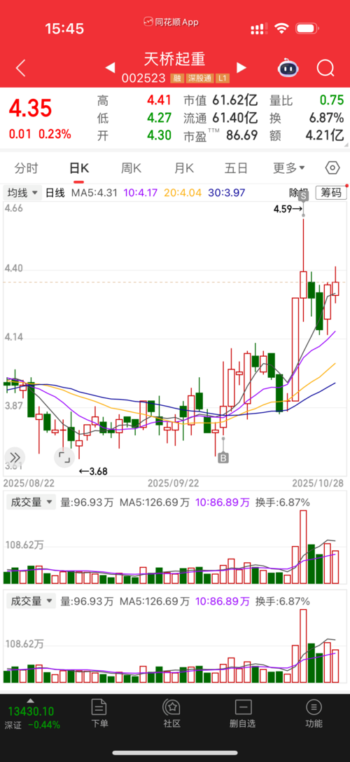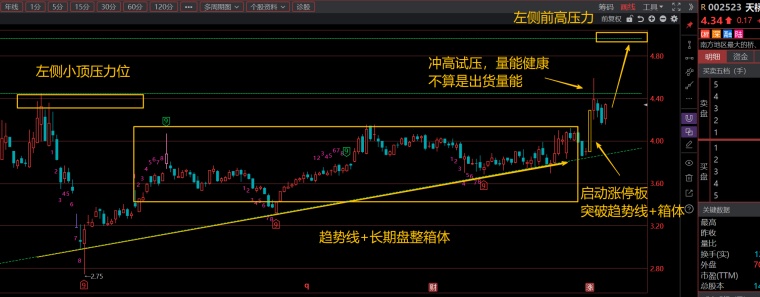 $天桥起重(SZ002523)$今天挑战了一下空头防区4.39