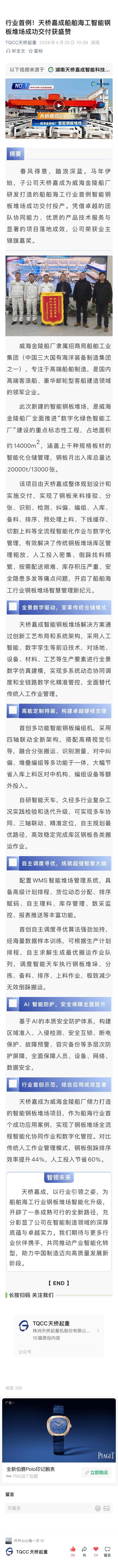 $天桥起重(SZ002523)$ 天桥嘉成匠心之作!船海行业首个智能钢板堆场成功交付获客户盛赞 原创天桥嘉成天桥嘉成湖南天桥嘉成智能科技有限公司2026年4月16日14:11湖南听全文在小说阅读器读本章去阅读在小说阅读器中沉浸阅读 已关注关注重播分享赞关闭观看更多更多退出全屏切换到竖屏全屏退出全屏湖南天桥嘉成智能科技有限公司已关注分享视频,时长01:10 0/0 00:00/01:10切换到横屏模...