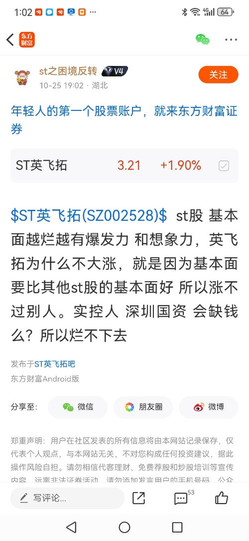$ST英飞拓(SZ002528)$st股基本面越烂越有爆发力和想象力,英飞拓为什么不大涨,就是因为基本面要比其他st股的基本面好所以涨不过别人。实控人深圳国资会缺钱么?所以烂不下去