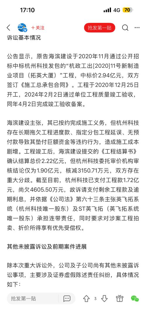 $ST英飞拓(SZ002528)$诉讼的是双方对工程款应付金额有异议,这5000w是双方的异议金额,已经付款了很大一部分。说白了就是一个觉得多一个觉得少。 再者开盘有意拉涨停被砸,下午再次拉涨停被砸,收盘又放出一条写的不全的诉讼,这明显是英飞拓自己故意而为之。
