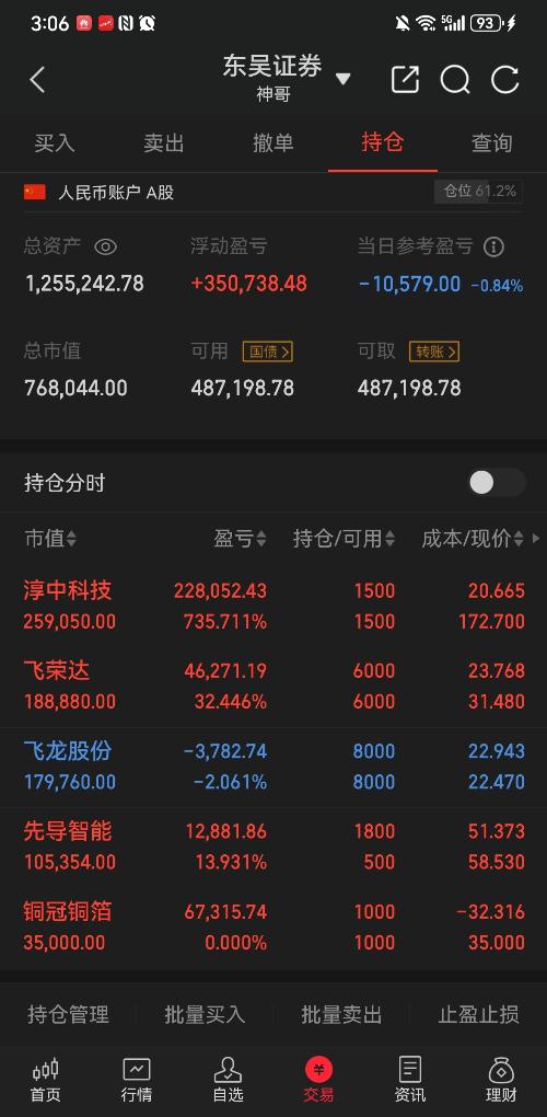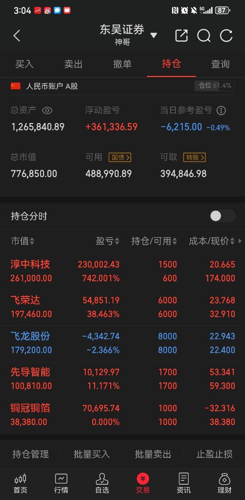 今天做t了淳中,淳中190前高位置减仓三分之二,尾盘又补回来,继续高抛减仓铜冠!其他股没动。$淳中科技(SH603516)$$铜冠铜箔(SZ301217)$$飞龙股份(SZ002536)$