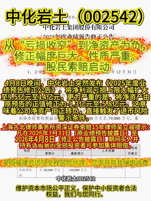 $中化岩土(SZ002542)$ 中化岩土(002542)从“亏损收窄”到净资产为负,修正幅度巨大,性质严重。4月8日晚间,中化岩土突然发布《2025年度业绩预告修正公告》,将净利润亏损上限大幅扩大至9.5亿元至14亿元,更为严重的是,将净资产由原预告的正值修正为-1.3亿元至-5.8亿元。这意味着公司净资产由正转负,直接触发了退市风险警示条件。原预告净利润亏损6亿—8亿元,修正后亏损9.5亿—1...