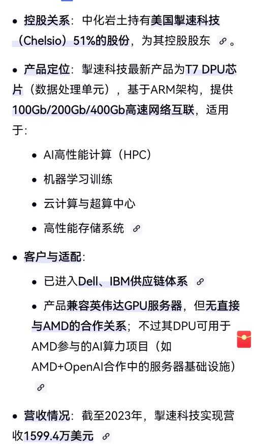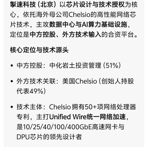 根据公开信息,中化岩土通过两种方式布局掣速科技: 直接控股:持有国内“掣速科技有限公司”51%的股份。3,4 间接参股:持有美国Chelsio公司11.08%的股权。3 美国Chelsio(掣速科技)是世界领先的芯片设计和软件开发公司,核心业务聚焦于为企业用户、数据中心、云计算中心、超算中心及移动用户群提供高性能网络连接和高性能数据存储解决方案。其产品线主打DPU/高速网卡芯片,覆盖100G/20...