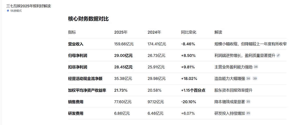 $三七互娱(SZ002555)$ 1.最核心利好:利润"含金量"与"含现量"双高,股东回报创纪录 增收更增利(且是高质量利润):虽然营收下滑8.46%,但归母净利润实现了8.50%的增长,扣非净利润增速更高达9.81%。核心驱动力是销售费用率的大幅下降(从去年的55.7%降至48.6%),意味着存量老游戏(如《Puzzles&Survival》《寻道大千》)已进入稳定回收期,不需要靠"烧钱买量"来...