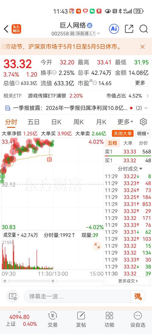 $巨人网络(SZ002558)$ 巨人网络收盘33.51元,+4.33%;成交额24.10亿,换手率3.83%,放量中阳,主力抢筹明显。 一、盘面:震荡走强,放量突破 •低开高走:开32.20,探底31.95后震荡上行,冲高33.70回落,尾盘收33.51,放量突破33元短期压力,终结三连阴。 •趋势:自4月24日低点30.79企稳,5日震荡回升,今日量价齐升,站稳5/10日线,短期多头格局修复。...