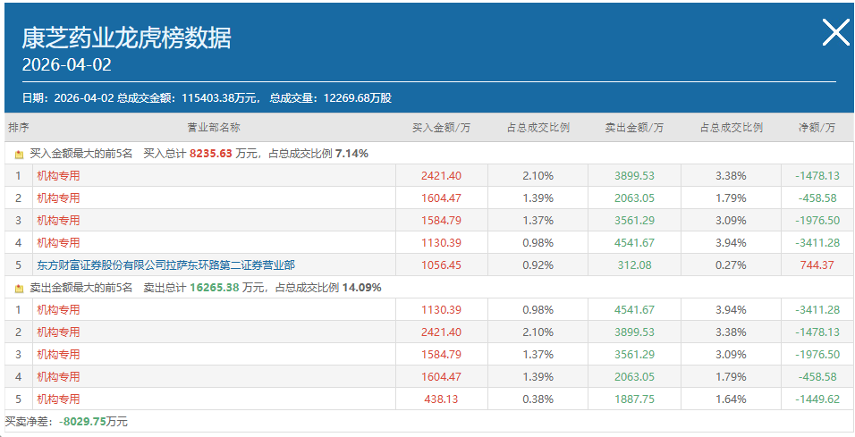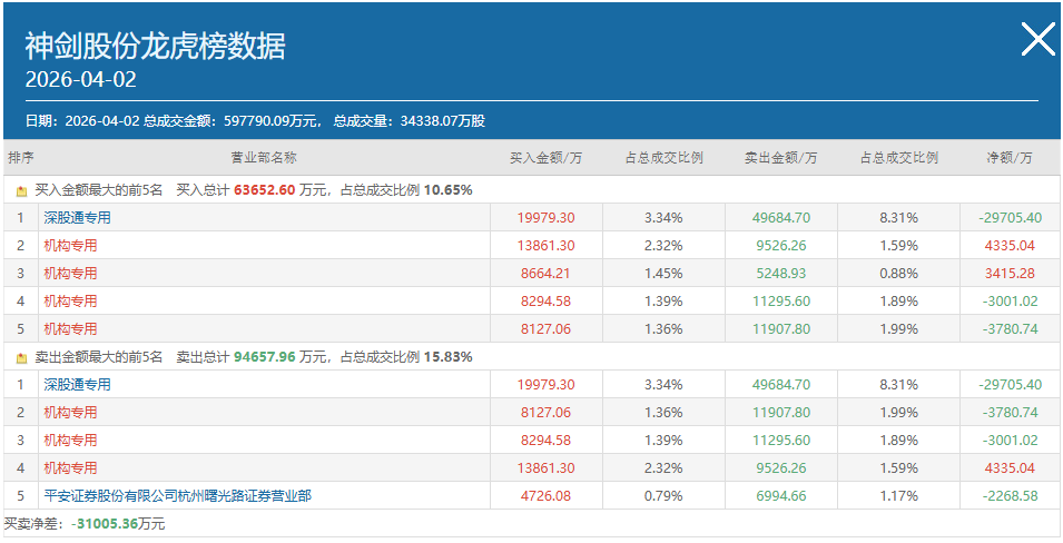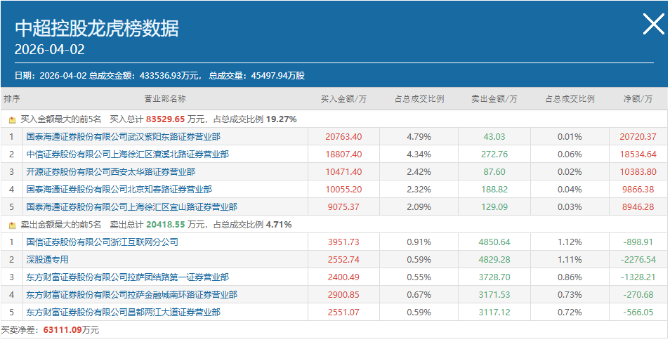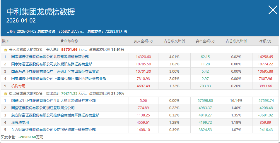 资讯 4月2日龙虎榜机构席位买卖详情
