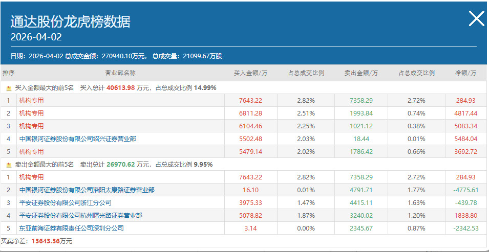 资讯 通达股份(002560)龙虎榜数据(04-02)